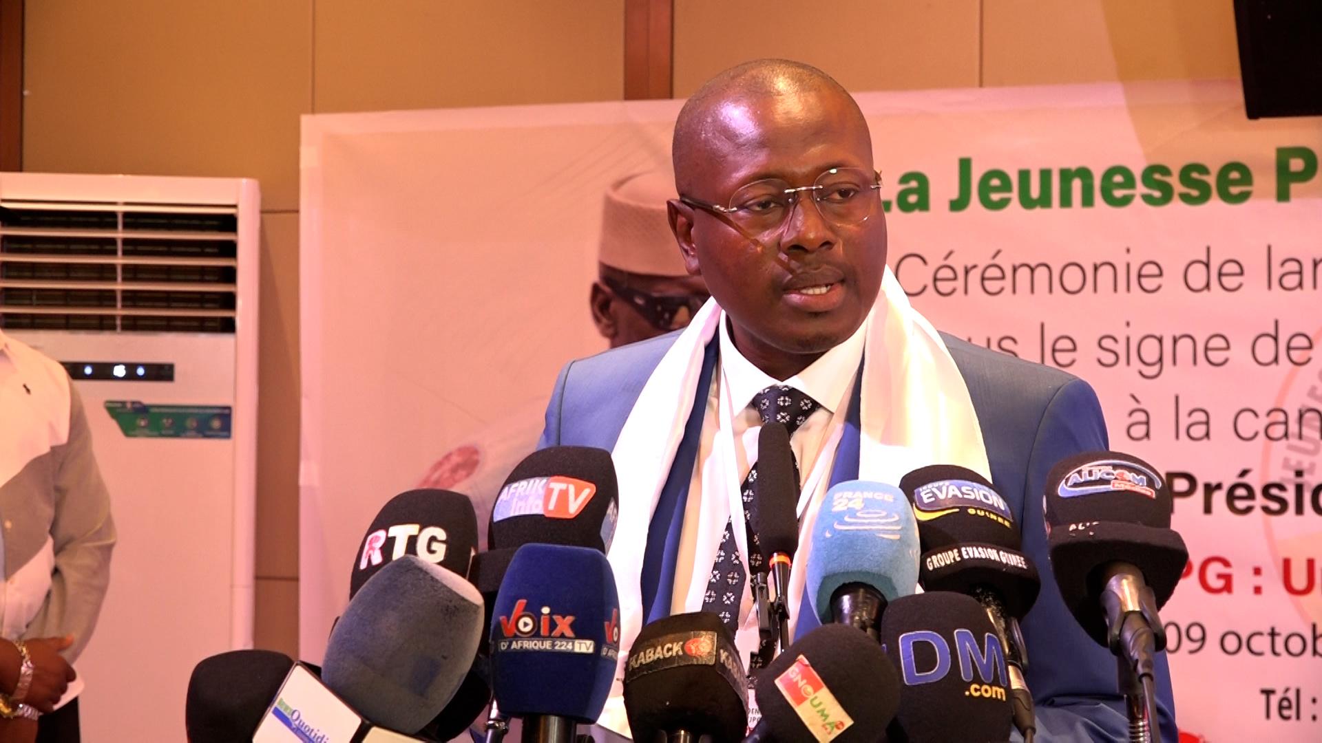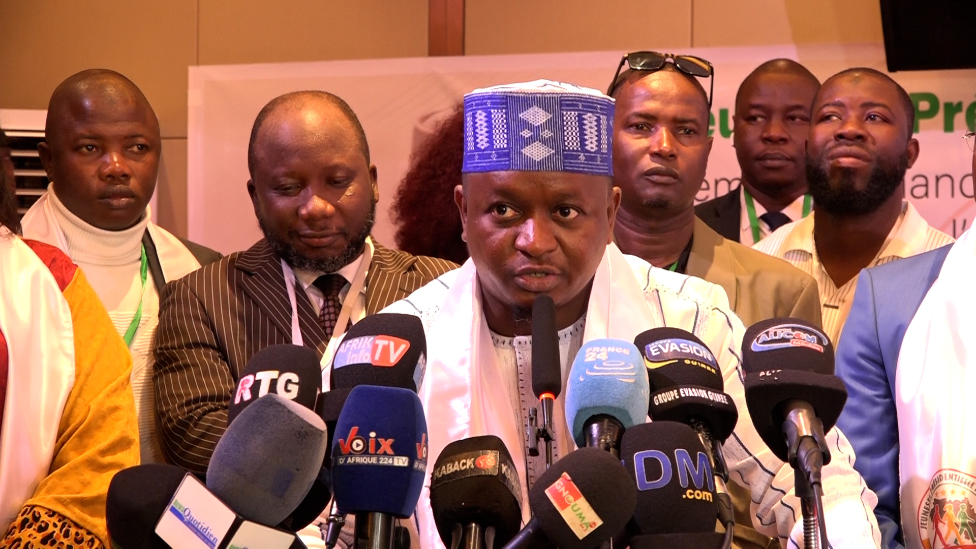<<Mesdames et Messieurs, chers invités, La jeunesse présidentielle de Guinée n’est pas une structure de plus. C’est une organisation citoyenne, patriotique et fédératrice, créée pour porter haut et fort la voix des jeunes qui croient au destin de la Guinée, autour d’une vision claire et assumée. Nous avons pour objectif soutenir et promouvoir la candidature du journal Mamadi Djembouia à l’élection présidentielle du 28 décembre 2025. >> declare le president JPG